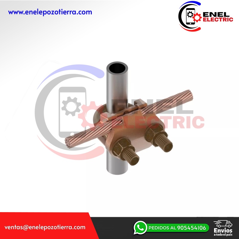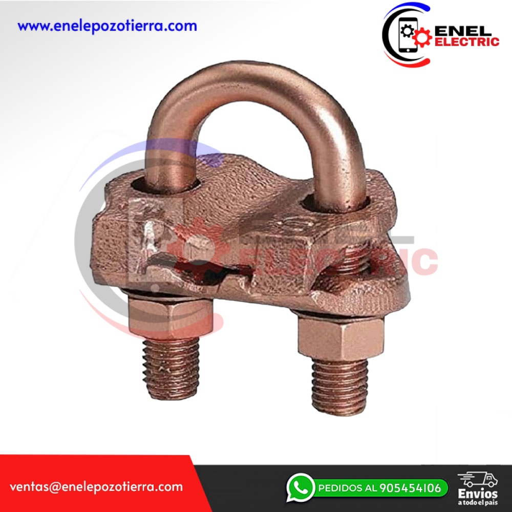 Características: Conector a tierra de aleación de cobre alto para unir una gama de cables, paralelo o en ángulo recto a varillas o tubos, especialmente bueno para postes de cercas, cuerpo fundido de aleación de cobre alto con pernos en U, tuercas y arandelas de seguridad DURIUM, permite que toda la conexión se entierre en tierra u hormigón sin peligro de corrosión, instalación con una sola llave, listado UL467, aceptable para entierro directo, altura: 2-7/8 pulgadas, tamaño de varilla de tierra: 5/8 - 3 /4 IN, Tamaño del tubo (ips): 3/8 IN, Par de instalación: 240 IN-LB, Tamaño de barra de refuerzo: #5 (5/8 IN) - #6 (3/4 IN).